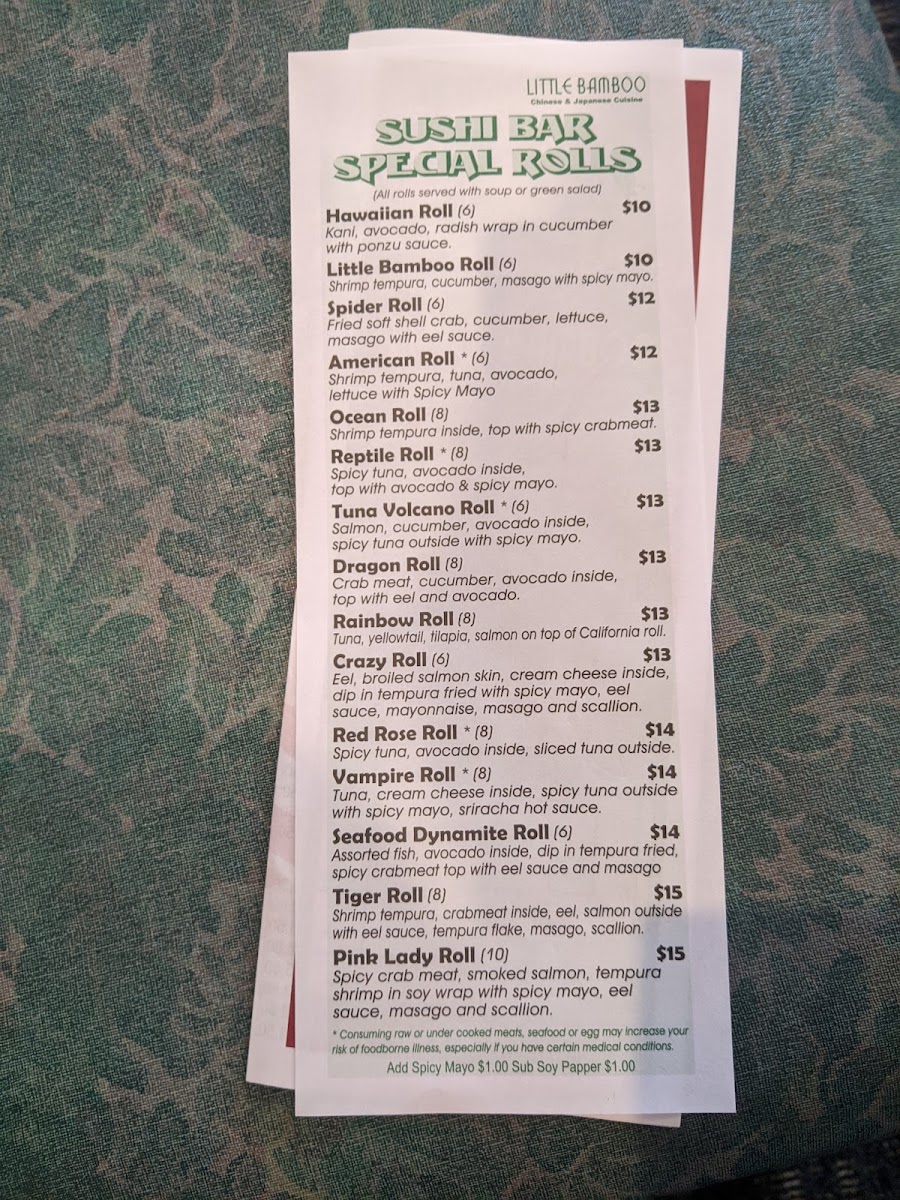 Choose any 2 Rolls from Roll or Hand Roll Menu; Please notice rolls that has *. Rolls with * contains raw fish or shell fish. Consuming raw, undercooked fish or shell fish may increase your risk of foodborne illness if you have certain medical conditions.